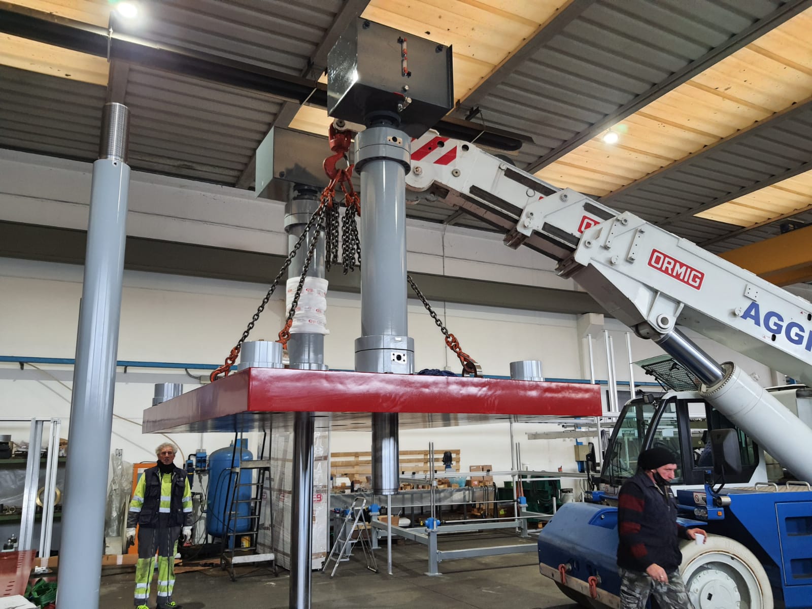 piano pressa per lastra di dimensioni massime 1950 x 2700 mm, forza di chiusura 400 ton, corsa di apertura 1500 mm. Predisposizione dei piani per la termostatazione. Carrello fuoriuscita del piano inferiore sul lato della pressa per permettere il cambio stampi. Sistema di presa del tessuto tramite pinze.