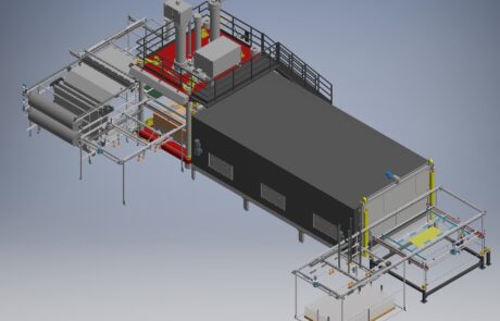 Il primo passo è stato di effettuare un test su dei campioni di LWRT per capirne il comportamento una volta riscaldato, verificando il tempo di raffreddamento e la deformabilità a caldo. Ciò ha consentito di validare il sistema di ancoraggio sul telaio di trasporto e definire il tempo limite tra l’uscita della lastra dal forno e la stampata. Successivamente abbiamo suddiviso l’impianto in varie aree e sviluppato i vari gruppi dapprima singolarmente e poi integrandoli nell’assieme generale per verificare eventuali interferenze e definire i posizionamenti dei fissaggi.